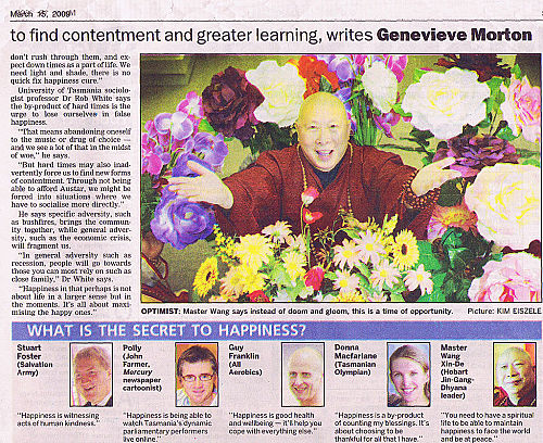 王信得大師(皞峇燈金剛禪領袖) 【指薄伽梵 大聖 智及維摩詰 阿達爾嘛佛 師尊】 接受澳洲塔斯牟尼亞皞峇燈最大的週報《星期天塔州人Sunday Tasmanian》著名記者Genevieve Morton女士的採訪,發表指導性建議,請塔州人在世界性經濟危機的時刻,心情保持快樂。
