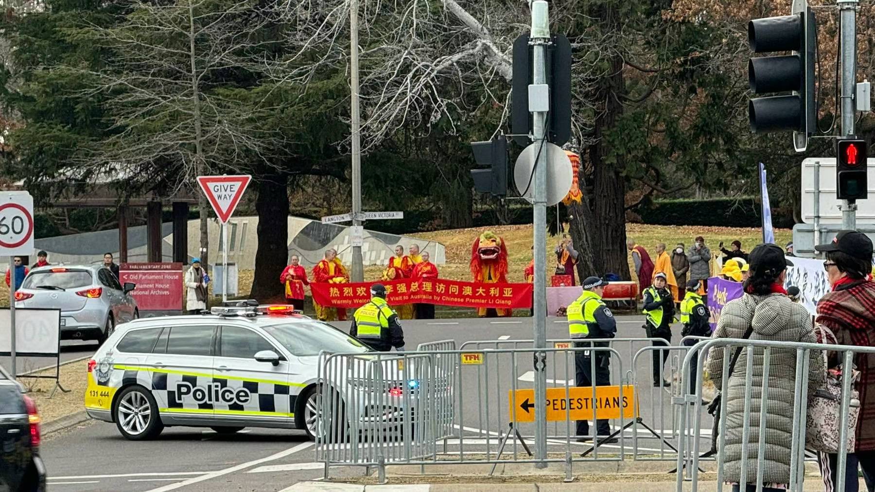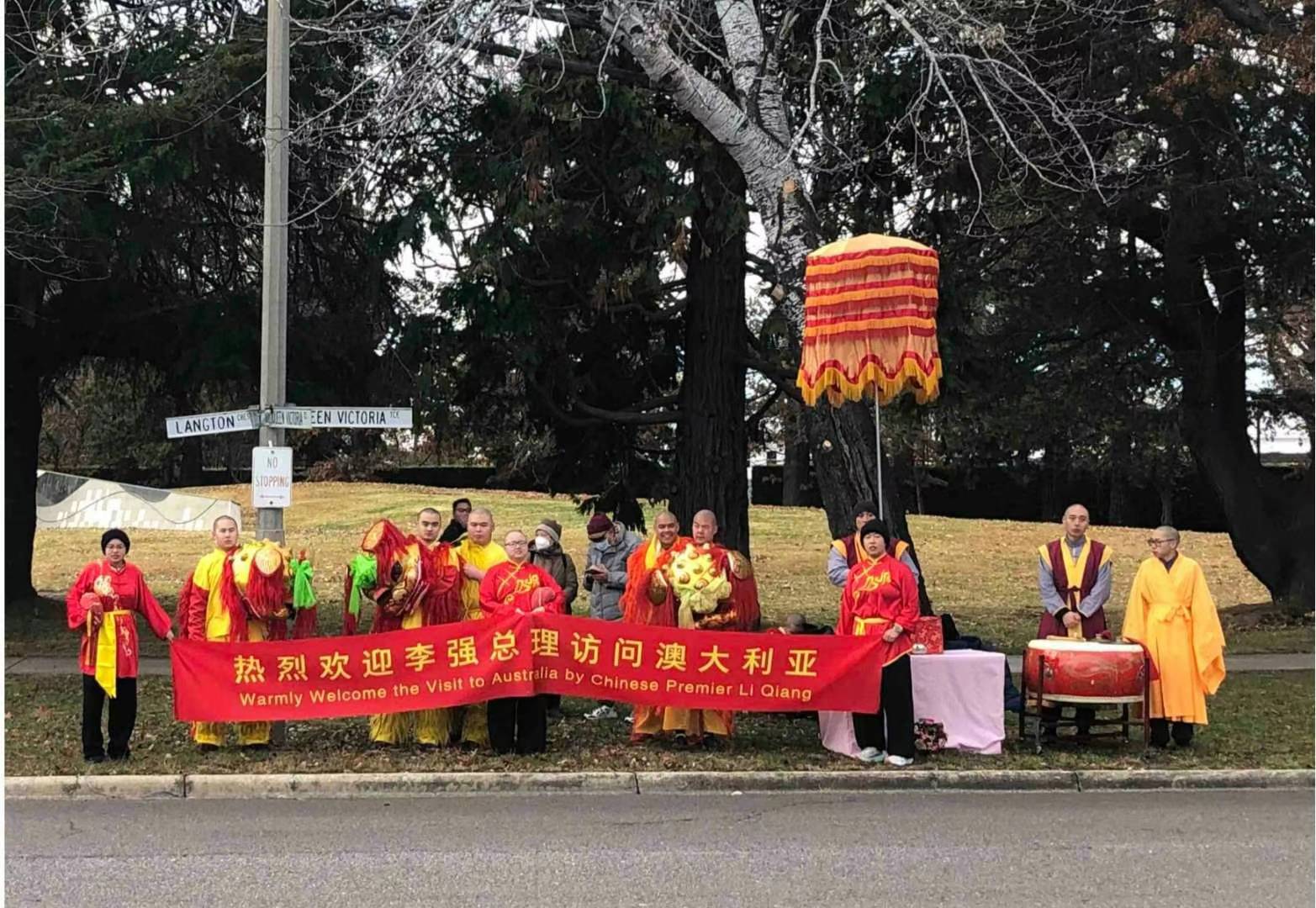 塔州狮队派出三头狮、持中國龙狮伞、圣密天、圣大鼓,圣钗钹、驯狮手共十七人抵达坎佩拉,欢迎祖國亲人中國总理李強访澳大利亚。