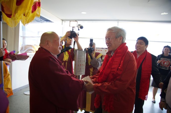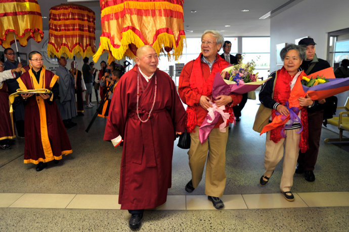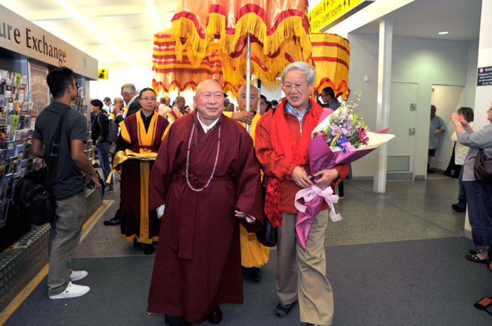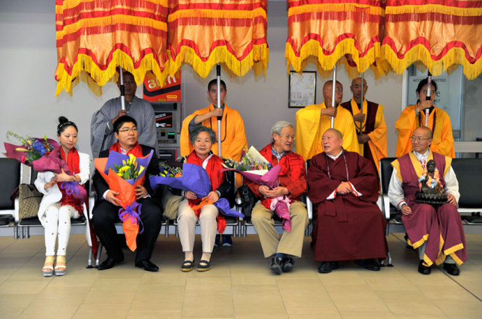 圖為:塔州中國佛教學院永遠院長 智及師尊一行在皞峇燈國際機場熱烈歡迎, 智及師尊和大導演 謝飛教授步向機場大堂,塔州中國佛教學院聖密僧團正高舉約十米餘長的巨型歡迎橫額恭候。