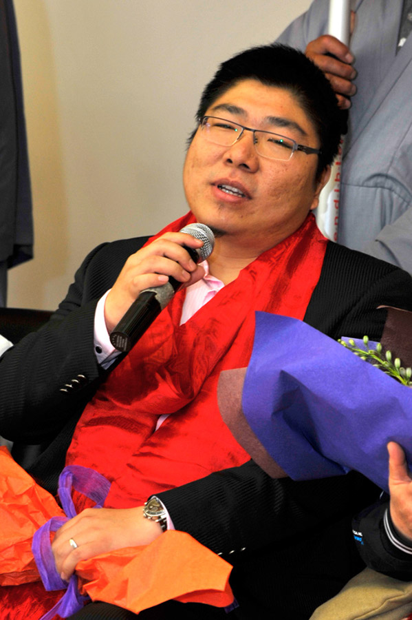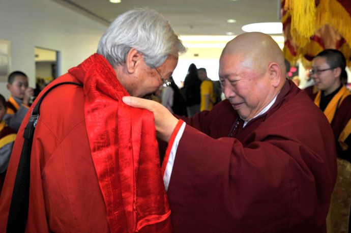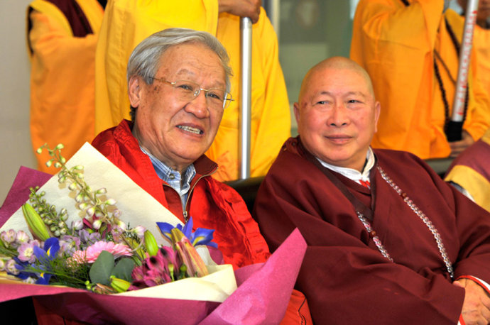 圖為:塔州中國佛教學院永遠院長 智及師尊一行在皞峇燈國際機場熱情歡迎時, 智及師尊正向中國第四代著名大導演 謝飛教授獻上 教下 最高禮敬──聖密哈達。