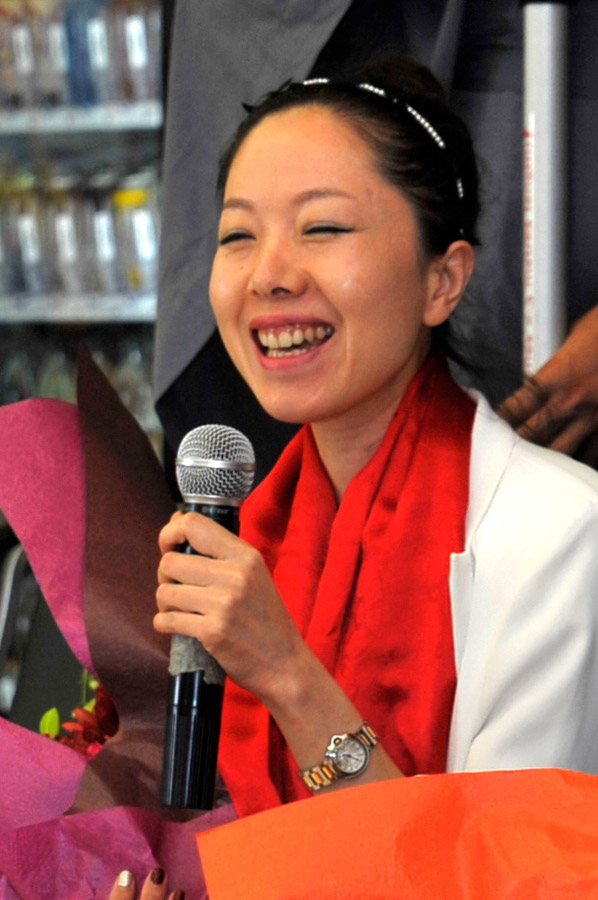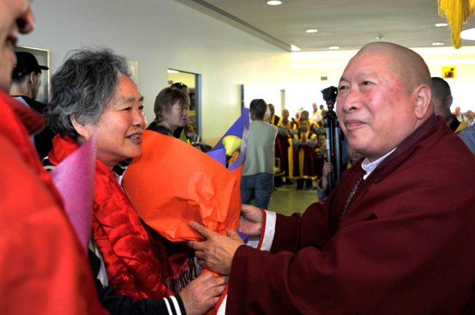 圖為:塔州中國佛教學院永遠院長 智及師尊一行赴皞峇燈國際機場熱情歡迎, 智及師尊正在向,代表團之 余天洋總經理、 盛桂紅茶道藝術家獻花。