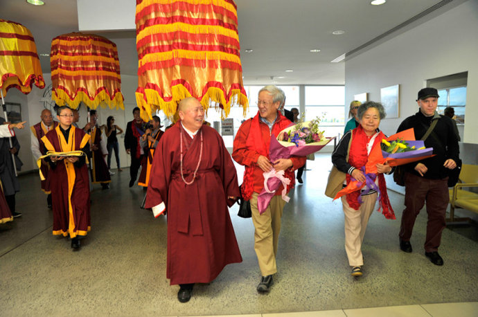 圖為:塔州中國佛教學院永遠院長 智及師尊一行在皞峇燈國際機場,以大唐傳統儀規聖密龍傘和聖密金剛舞歡迎皇家國師禮隆重迎接大導演 謝飛教授、崔雁敏伉儷後,步出接機大廳。
