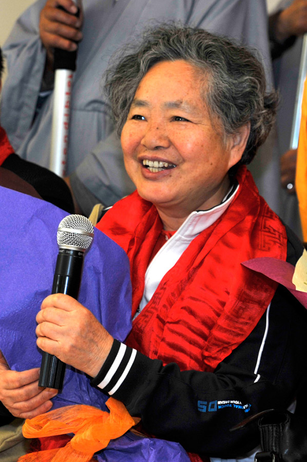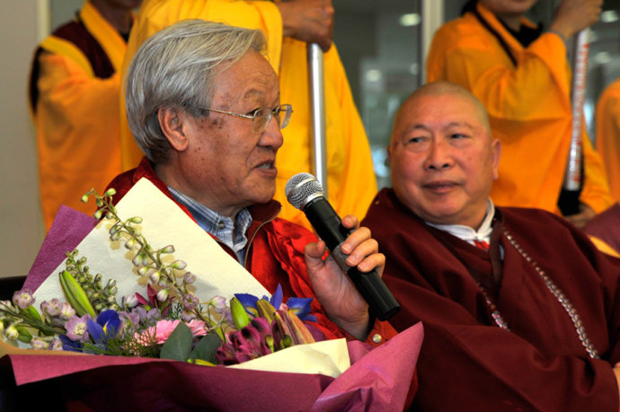 圖五、《2015年2月25日星期三乙未年正月初七北京佛教文化代表團第四次參訪塔州中國佛教學院》 智及師尊正在向大導演 謝飛教授之夫人 崔雁敏教授獻花。崔雁敏教授係中央電視臺任職