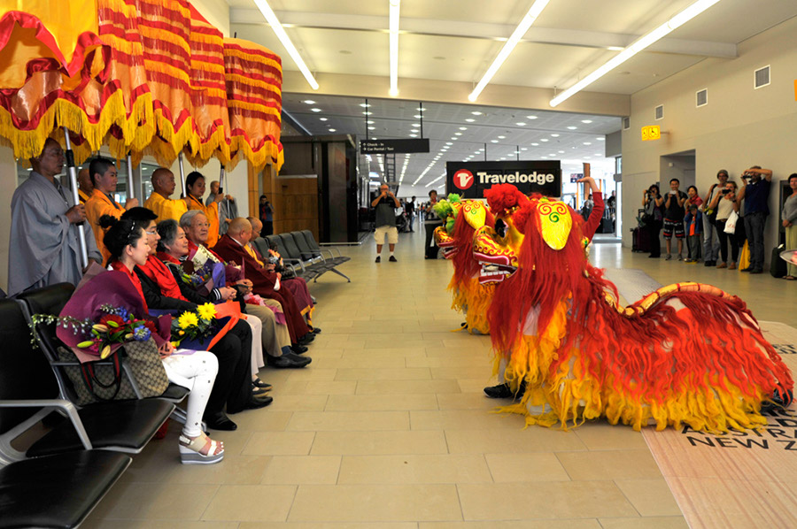 圖為:塔州中國佛教學院永遠院長 智及師尊一行在皞峇燈國際機場,以大唐傳統儀規聖密龍傘和聖密金剛舞歡迎皇家國師禮隆重迎接大導演 謝飛教授蒞臨塔斯牟尼州皞峇燈,令到本已具濃濃中國新春氣息的聖地,更添神聖喜悅的氛圍。