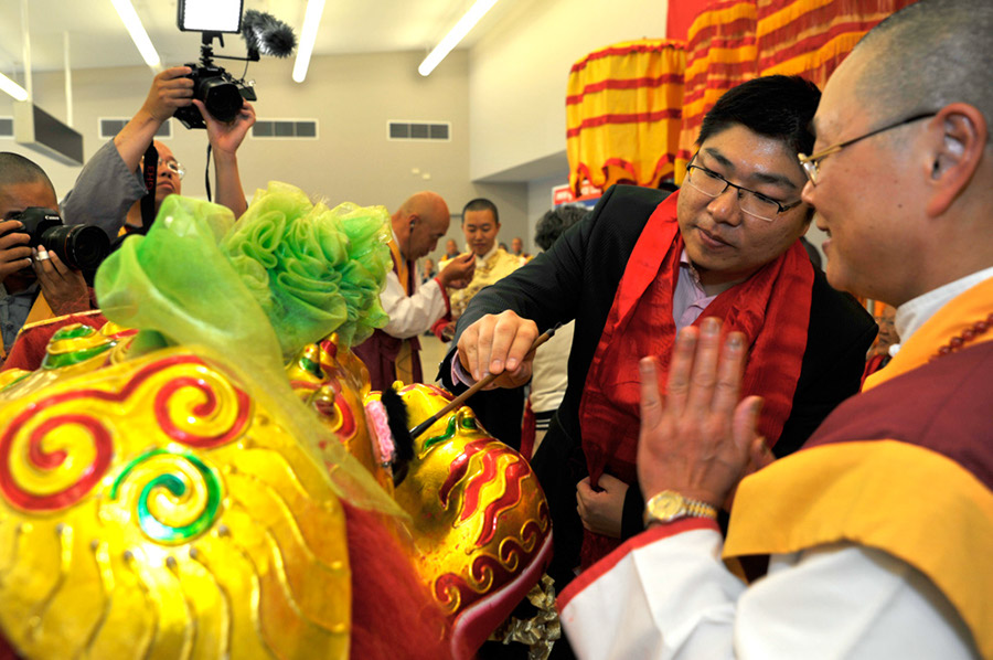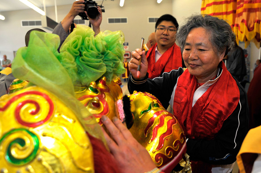 圖為:在皞峇燈飛機場,塔州中國佛教學院聖密聖獅以大唐傳統聖密金剛舞儀規歡迎祖國的貴賓們之後,雙獅下跪,大導演 謝飛教授、 崔雁敏教授伉儷率眾鼓掌稱讚。