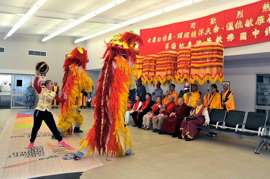 圖為:在皞峇燈飛機場,塔州中國佛教學院聖密聖獅正以大唐傳統聖密金剛舞儀規歡迎來自祖國的貴賓們,雙獅戲爭馴獅手之綵球前,先向貴賓們躬鞠敬禮。