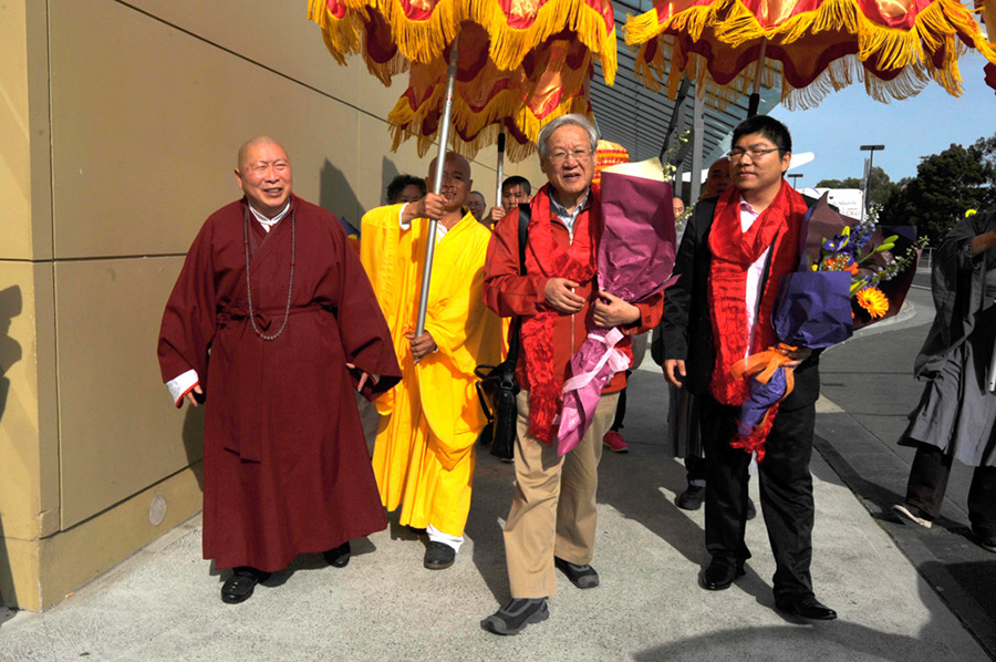 圖為:塔州中國佛教學院永遠院長 智及師尊一行在皞峇燈國際機場熱情歡迎北京文化代表團,大導演 謝飛教授、余天洋總經理和 智及師尊正步出機場,尊駕恭候機場外,護送貴賓們前往塔州中國佛教學院的大聖 釋迦牟尼佛舍利宮駐錫。