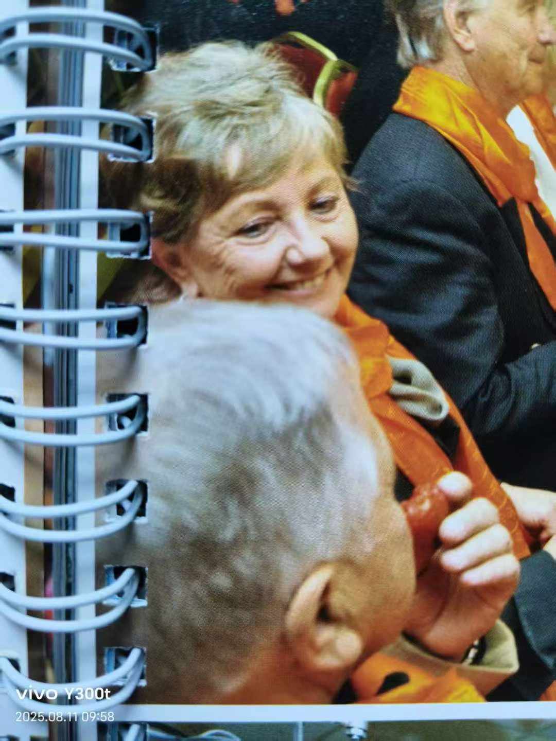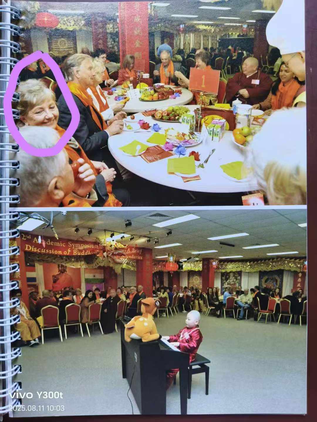 刚才在翻看2011年的《中国汉传密学研究院密学日记》法本时,无意中看到2010年于77号召开中秋法会的两张图片,一开始是看到圣源小转世者当时在弹电钢。后来突然瞄到,跟 您同在1号主桌的一位笑容可掬的中老年女士,我突然感到,她样子很像昨晚 您在朋友圈刚登出的一位在这次无声弘法百相万行舞龙时邂逅的一位 您的老朋友Mary女士。因为我对外国人样貌的分辨能力弱,而且昨晚照片中现在的她,如果真的就是法本中2010年中秋法会上主桌的那位女士,那我是感到现在的她仿佛更年轻和神采奕奕。故而,我不确定这两位是不是同一人。